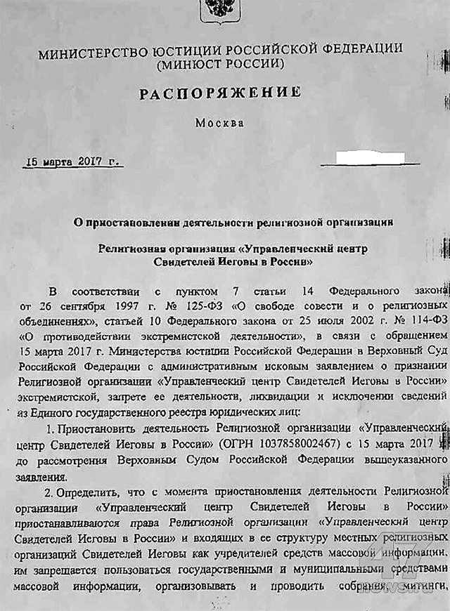 За последние годы в России состоялось несколько судебных процессов против местных общин «Свидетелей Иеговы» – их, как правило, обвиняют в экстремистской деятельности и хранении запрещенных материалов. В связи с этим Минюст выпустил распоряжение за подписью первого замминистра Сергея Герасимова о приостановлении деятельности «Свидетелей Иеговы». «Приостановить деятельность Религиозной организации ...с 15 марта 2017 года до рассмотрения Верховным Судом вышеуказанного заявления», - говорится в документе.
