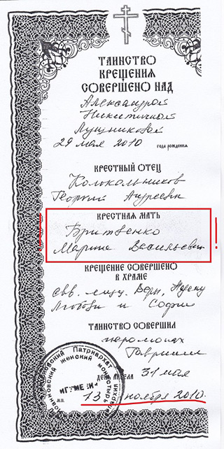Фото 9 - Свидетельство о крещении в православном храме дочери Лушниковых Александры. Крестный отец - сектант-неопятидесятник, основатель "Царства Бога", "епископ" секты Сергей Бритвенко.